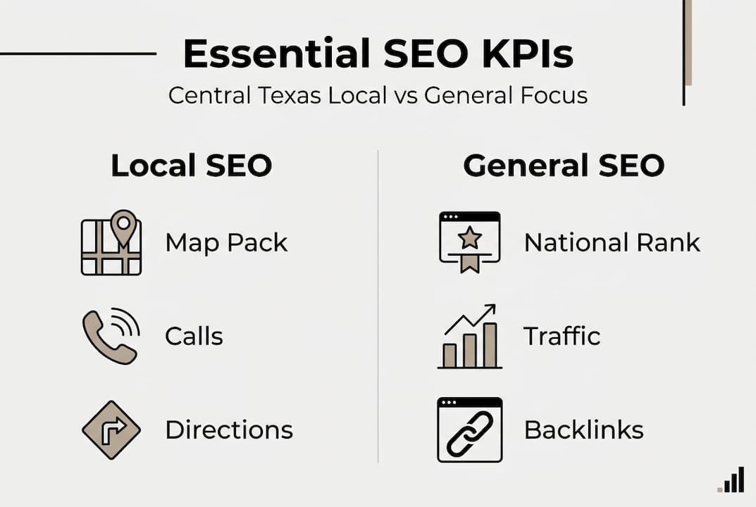 Local SEO KPIs are different from what a national brand tracks. You're not trying to rank in Seattle. You're trying to show up when someone in Manor or Georgetown searches for exactly what you offer.